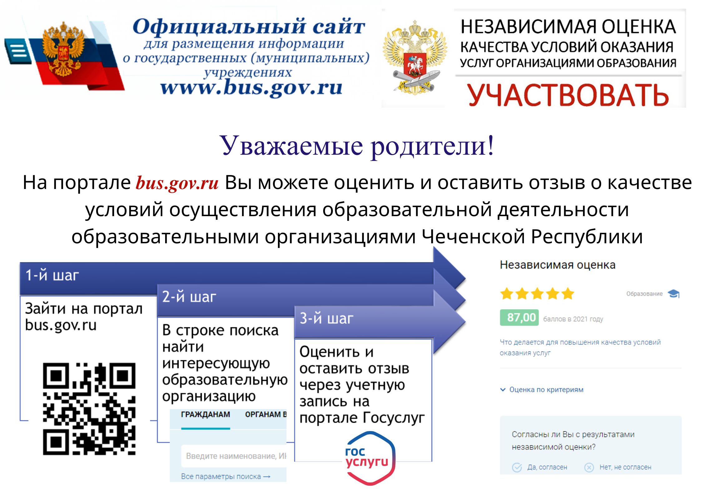 07.09.2022Уважаемые родители, на портале bus.gov.ru вы можете принять участие в оценке качества условий осуществления образовательной деятельности образовательными организациями Чеченской Республики